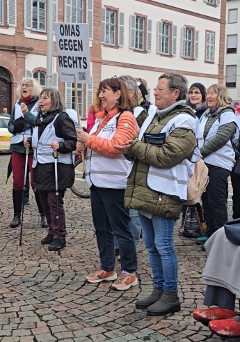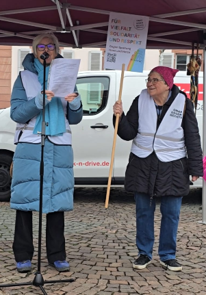 Die Rednerin unserer Regionalgruppe war Petra Elmer, die zuerst auf das Selbstverständnis der OgR hinwies: „Unser Umgang miteinander ist wertschätzend, respektvoll und aneinander zuhörend. Wir haben Toleranz für andere Sichtweisen und respektieren das Gegenüber im Anderssein. Aber wir widersetzen uns allen Formen von Rassismus, sind gegen rechte Hetze und gegen eine Politik, die Menschen abwertet und gegeneinander ausspielt.“ Sie forderte die PolitikerInnen auf, Kompromisse zu finden, sich nicht spalten zu lassen und unter keinen Umständen mit der AfD zusammen zu arbeiten. Ihr Plädoyer war sehr eindringlich und fand große Zustimmung bei der Gruppe von Menschen, die gekommen waren.