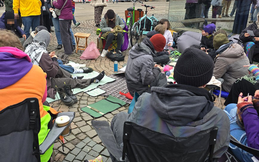 Die AfD, um die es ging, hatte ihren Infostand vor der Post aufgebaut. Davor hatten sich junge Frauen und Männer niedergelassen, sie wollten einer undemokratischen Partei nicht ohne Widerstand diesen Raum geben. Ihren Protest brachten sie sehr kreativ zum Ausdruck: Sie saßen auf Picknickdecken mit ihrem mitgebrachtem Handarbeitsmaterial und demonstrierten, dass rechte Maschen nur beim Stricken akzeptabel sind.