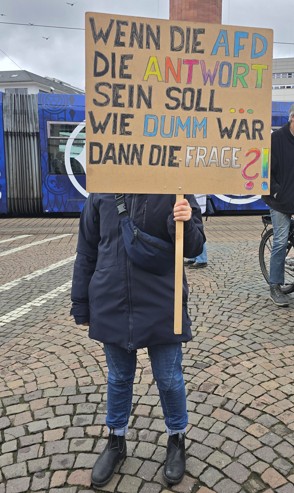 Bei kaltem Wetter hatten sich einen Tag vor der Kommunalwahl auf dem Luisenplatz engagierte Menschen versammelt, die ihre Haltung gegenüber der menschenverachtende Politik der AfD deutlich gemacht haben: Neben Murat und Martin Zwilling vom Bündnis gegen Rechts hielten unter anderem Dorothea Köhler von „Community for all“ , die Studis gegen Rechts, die Schülis gegen Rechts, Seebrücke und Solid leidenschaftliche Reden gegen rechte Hetze und gegen eine Politik, die Menschen abwertet.