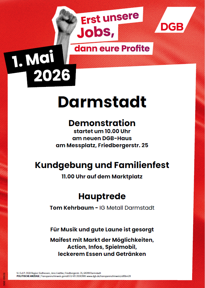 Unter dem Motto „Erst unsere Jobs, dann eure Profite!“ ruft der DGB am 1. Mai 2026 gemeinsam mit den Gewerkschaften zu bundesweiten Aktionen auf. Auch in Darmstadt wollen wir an diesem Tag wieder gemeinsam auf die Straße gehen und das laut, bunt und solidarisch!